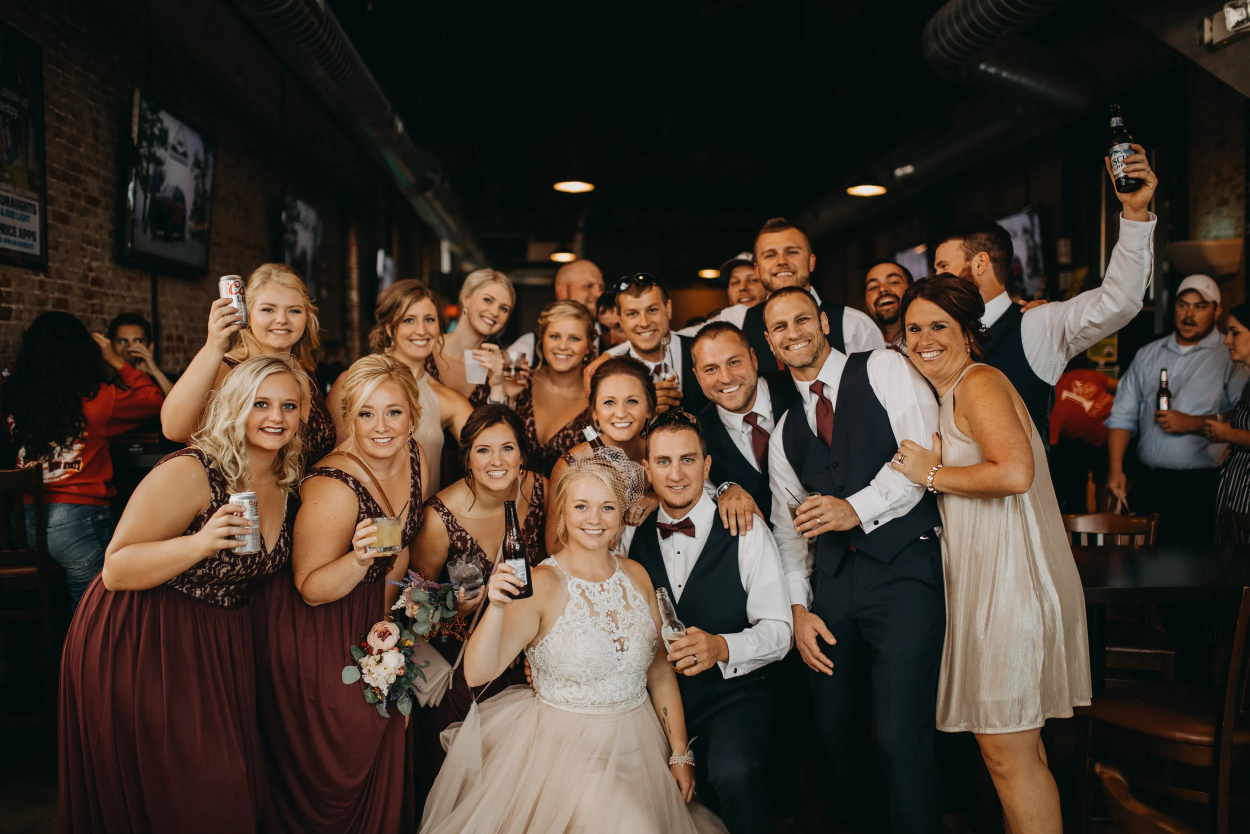 Ain’t no party like an Iowa party! I love when couples choose to take the time between their ceremony and reception to go out to some bars, or bowling, or whatever they want with their friends. We had a blast following them in the party bus to their favorite local bars, and we threw together this fun group shot with their bridal party.
